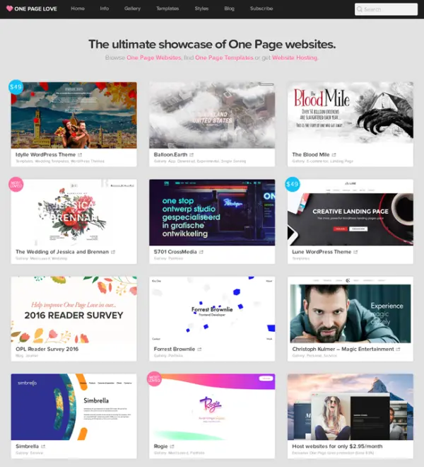 One Page Love 是一个汇集了优秀的单页网站、模版等资源的分享站点。由 Rob Hope 创立于 2008 年。目前已收录 25+ 多种行业分类的模版。