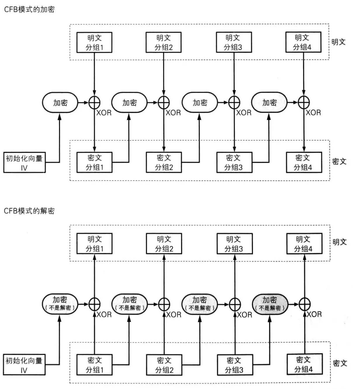 在CFB模式中,前一个密文分组会被送回到密码算法的输入端.示意图如下所示: