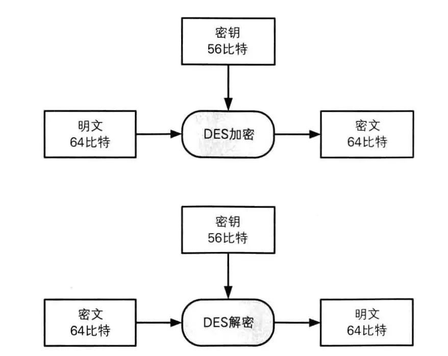 一种将64比特的明文加密成64比特密文的对称密码算法。des的密钥长度规格上讲是64位,因为每隔七比特设置一个错误检查比特,实质密钥长度是56位。示意图如下所示: