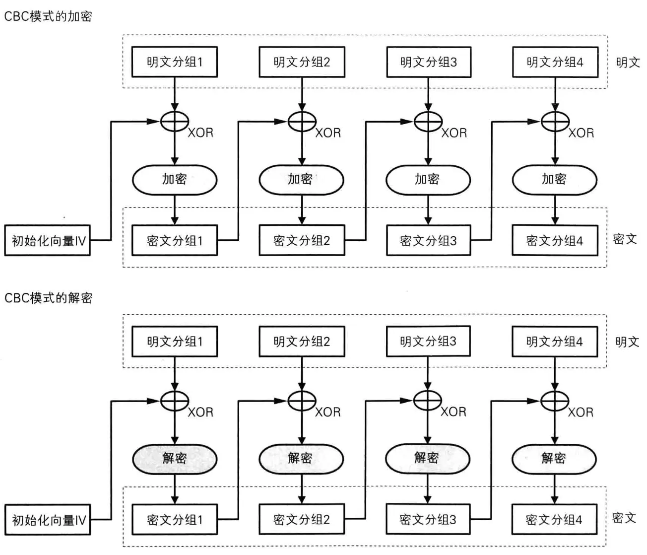 在CBC模式中,首先将明文分组与前一个密文分组进行异或运算,然后再进行加密(初始化向量IV).示意图如下所示: