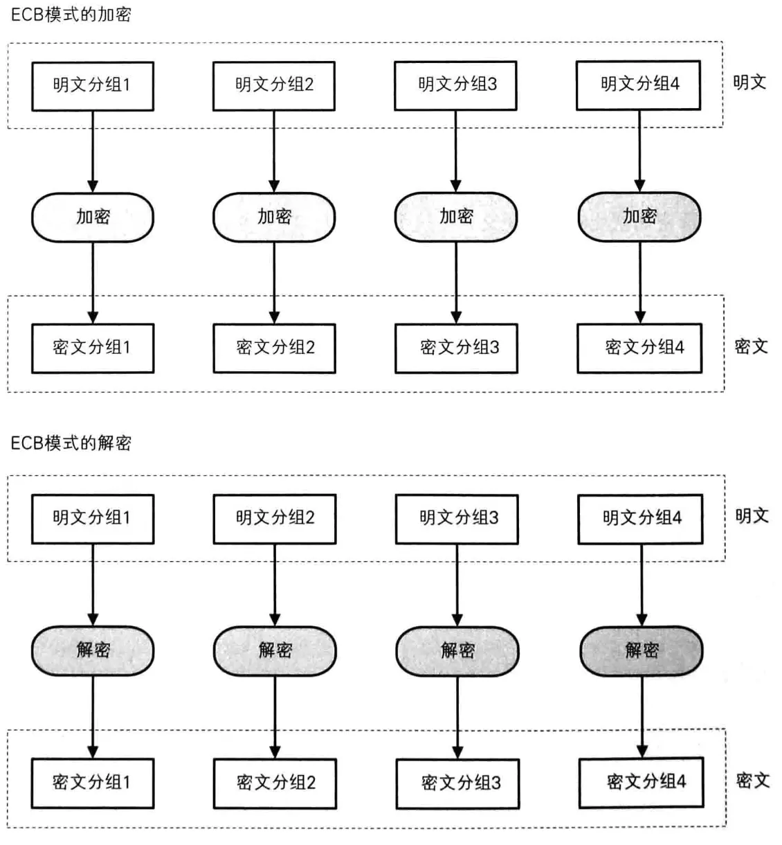 在ECB模式中,将明文分组加密之后的结果直接成为密文分组.示意图如下所示:
