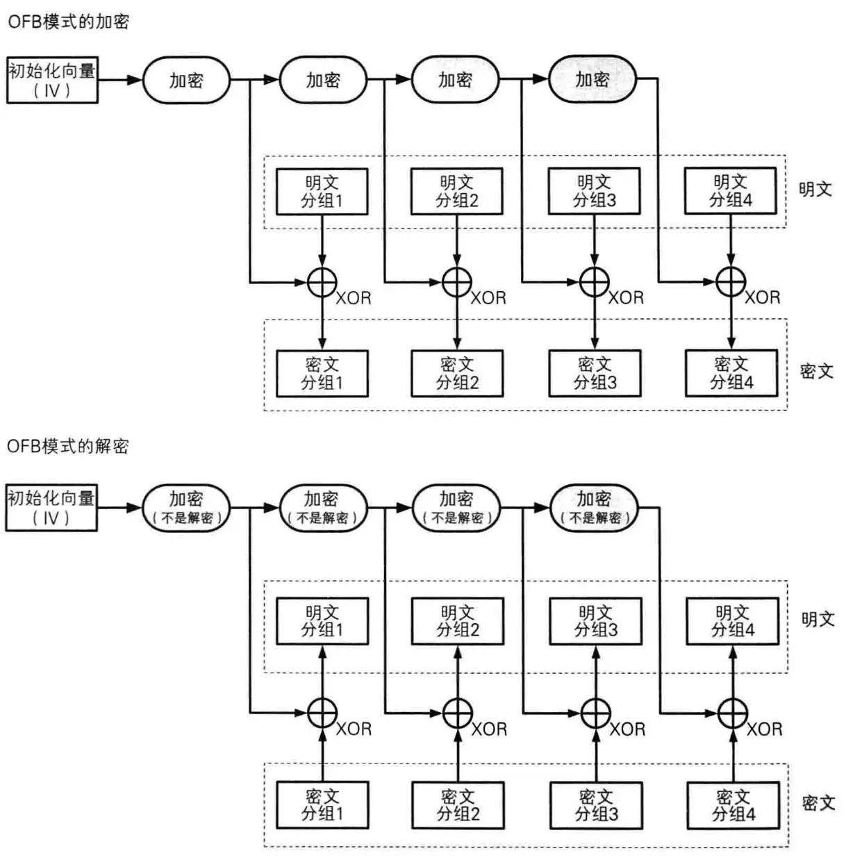 在OFB模式中,密码算法的输出会反馈到密码算法的输入中。示意图如下所示: