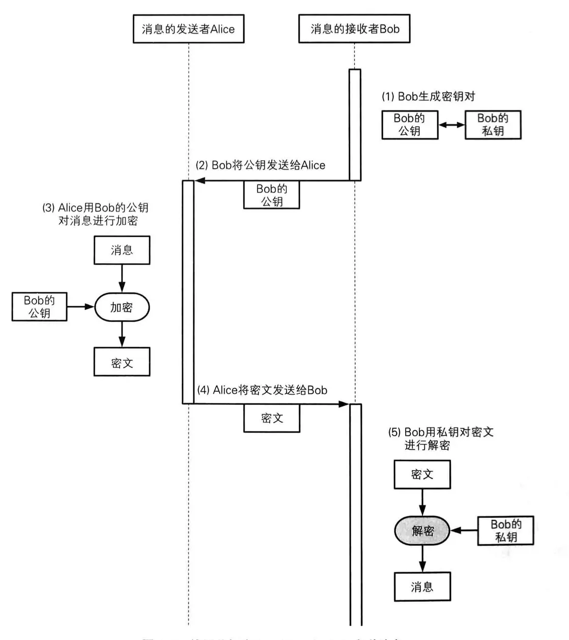 跟对称加密不同,非对称加密在加密和解密两个阶段使用的是不同的密钥。加密时候使用的密钥我们称之为公钥,解密时使用的密钥称之为密钥。通常公钥都是公开的,私钥是通信双方自己保留不能公开的。在非对称加密中使用到的主要是 RSA算法 。其交互流程大概如下所示: