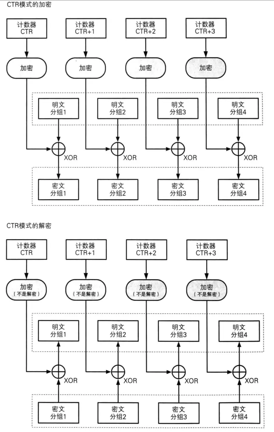 | CTR模式 | 不需要填充; 可事先进行解密、加密的准备; 加密、解密使用相同结构; 对包含某些比特错误的密文进行解密时, 只有明文中相应比特会出错; 支持并行计算(加密、解密) |