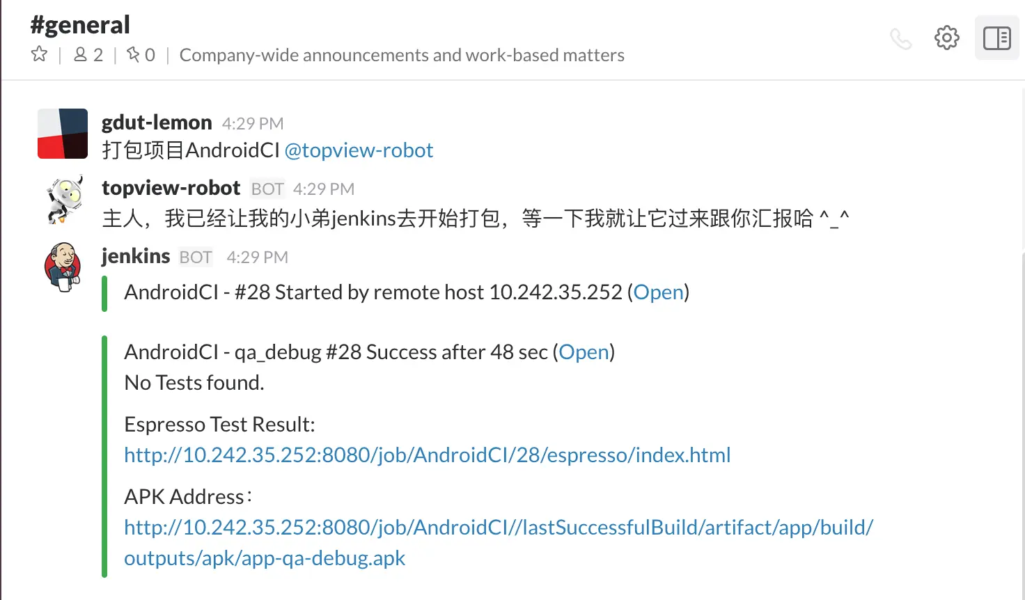 就像上面的最后一张截图那样,当你把Jenkins安装配置好之后,你就能够随时随地的使用你的手机向机器人发送一条指令,然后接下来神奇的事情发生了,Jenkins服务器就会开始"拉取远程代码更新->设定打包参数->参数化构建->单元测试->ui测试->打包->生成测试报告->上传安装包->通知团队成员"(并且这仅仅只是非常基本的事情)。