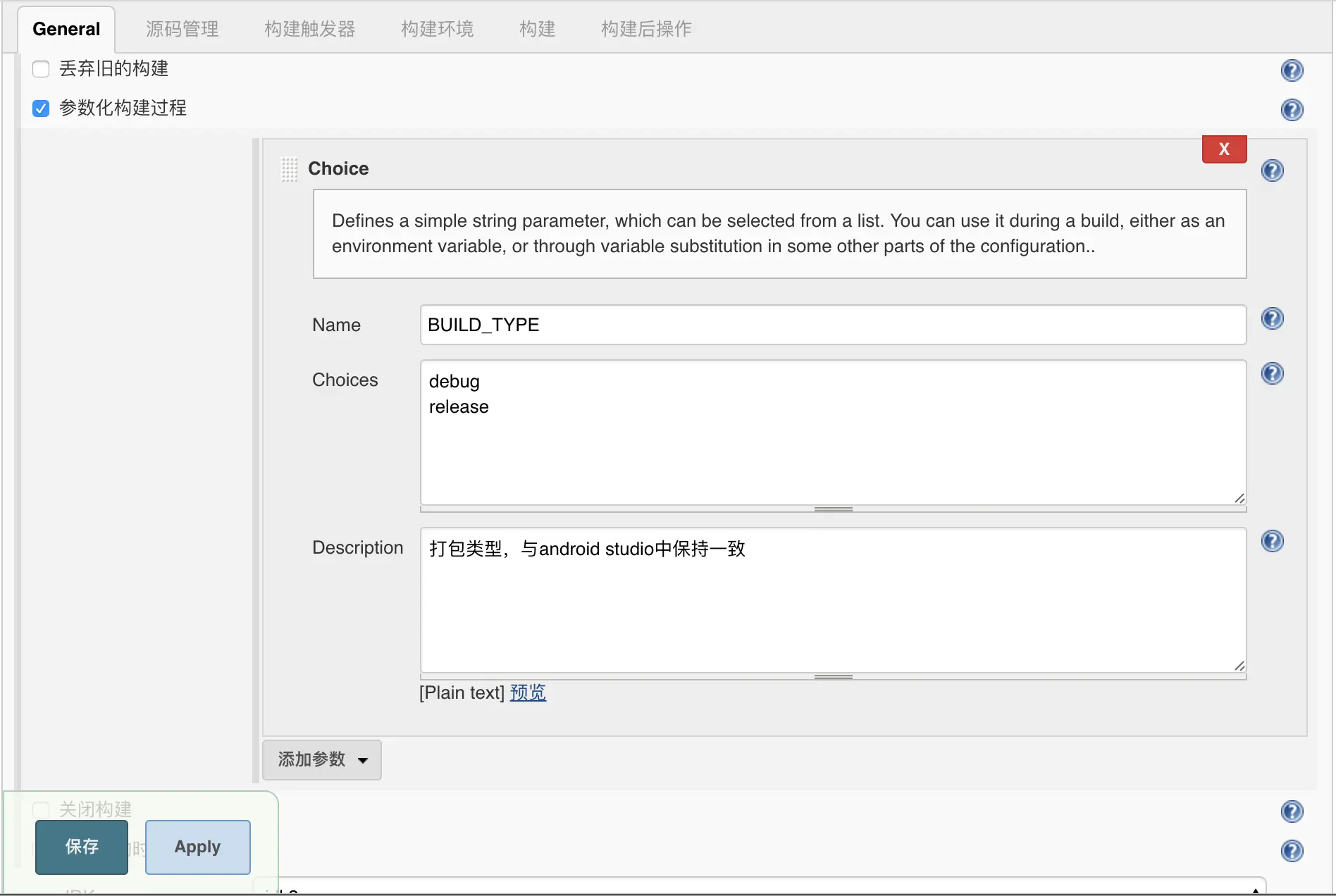 jenkins参数话构建跟我们在android studio中设定buildtype、productflavor等等相类似,只是我们可以设置更多的参数类型。并且这里定义的所有参数类型可以在下面的构建中的脚本直接使用。