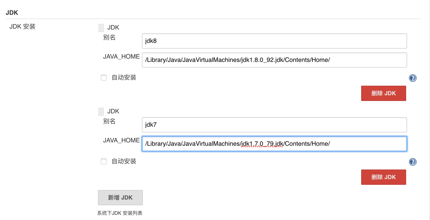 在"系统管理->Global Tool Configuration"路径下面,我们可以配置我们的jdk,如下图所示: