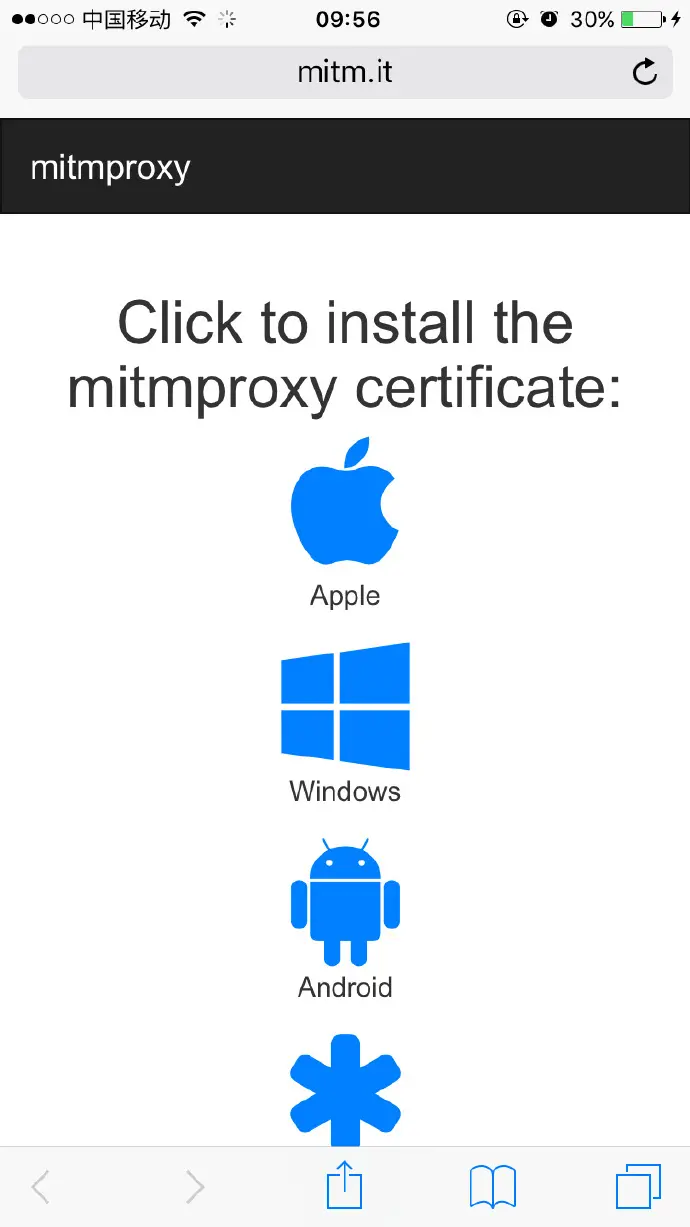 下面的操作是针对 iPhone 手机,其他设备也类似。用 iPhone 打开 Safari 浏览器并输入 mitm.it,这时你会看到如下页面,