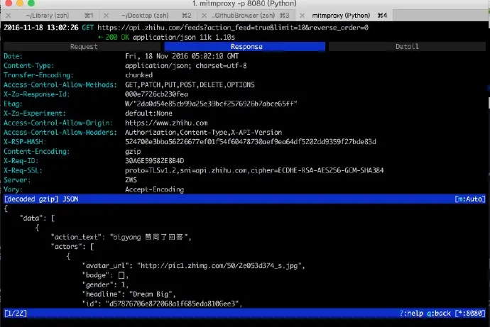 在 Mac 上常用的抓包软件是 Charles,网上关于 Charles 的教程很多,这里介绍另一个抓包神器 mitmproxy。mitmproxy 是一款可交互式的命令行抓包工具,它除了可以抓包查看 http/https 请求,还有一个很强大的功能是拦截并修改 request 或者 response,后面我会用实际例子演示如何修改知乎的回答:)