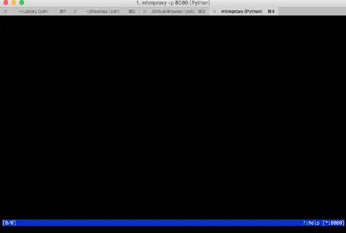 网络环境配置完成后我们可以开始实际的抓包了,只需在电脑上打开终端(命令行操作窗口),然后输入 mitmproxy -p 8080,如果你看到如下页面说明你已成功进入抓包模式,迈出了第一步,cheer~