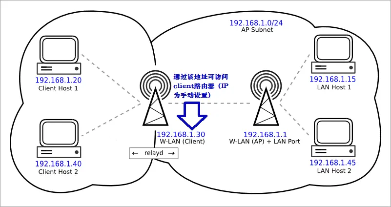 # 添加中继桥相关配置config interface 'stabridge' #添加中继桥option proto 'relay'option network 'lan wwan'# 从路由器lan口ip地址不宜和主路由ip地址冲突config interface 'lan'...option ipaddr '192.168.1.30' #手动指派从路由ip地址v,比如主路由是192.168.1.1,此处可以是192.168.1.2