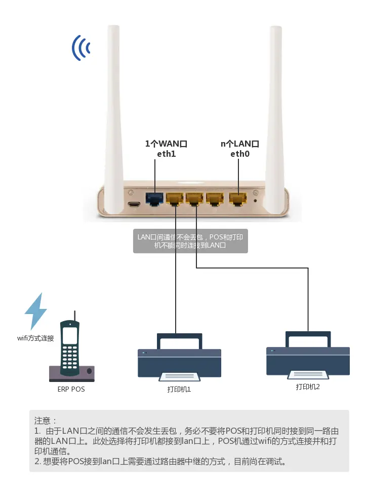 此处应该注意lan口之间通信走的是内部交换机,不会发生丢包现象,因此不能把pos机和打印机同时接到同一个路由器的LAN口上。要想让pos接LAN口怎么办?当然是使用桥接的方式。此处因为要求pos机和打印机的ip地址在同一个网段上,因此不能使用中继的方式,中继要求两个路由器使用不同的ip网段,比如192.168.1.1和192.168.121.1;而桥接模式则是192.168.1.1和192.168.1.2这样的。