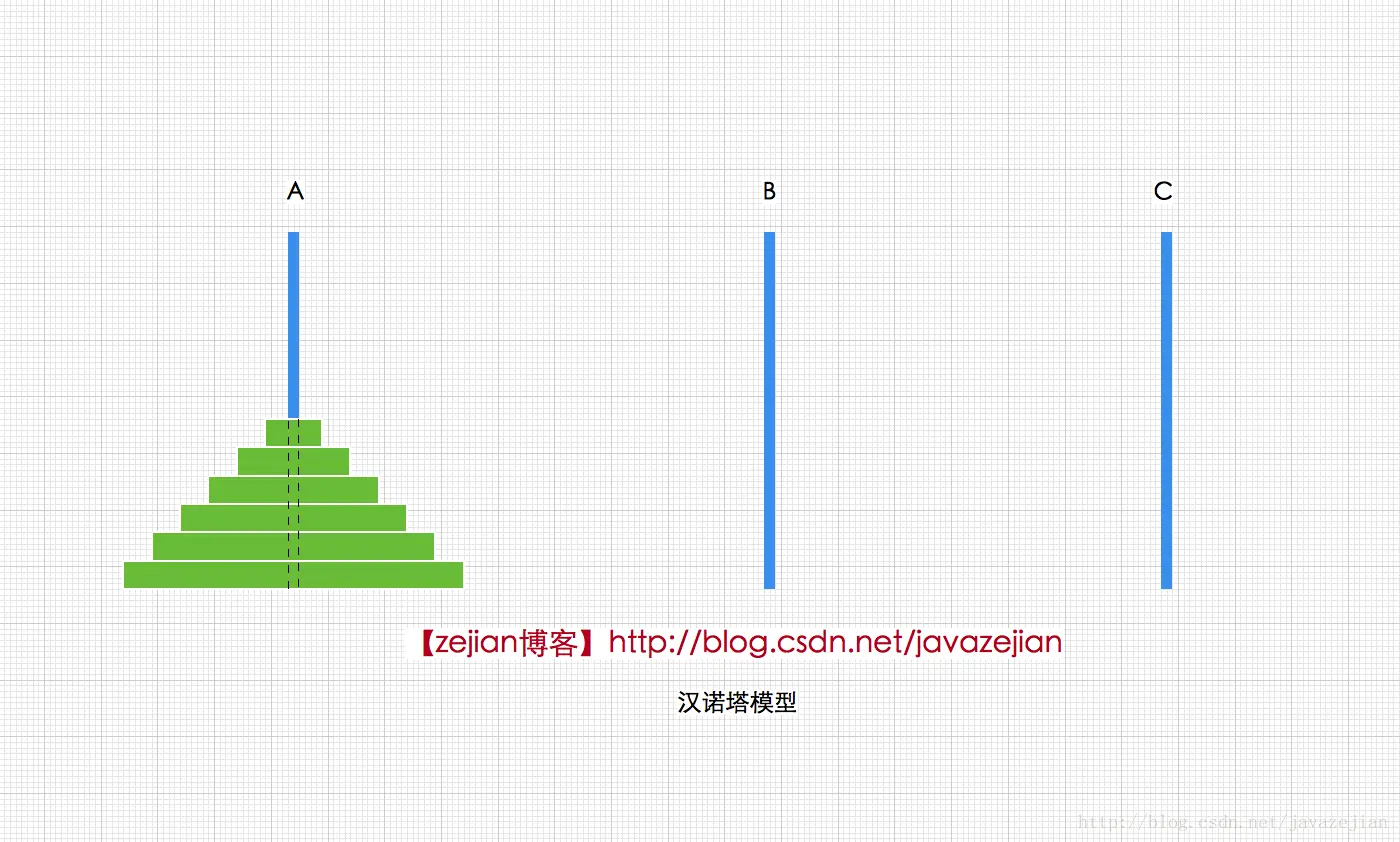 现在我们先不需要知道递归是什么,也没必要,我们先来看一个非常经典的游戏—汉诺塔,该游戏是数学家爱德华卢卡斯于1883年发明的,游戏的规则如下,有三根细柱(A、B、C),A柱上套着6个圆盘,圆盘的大小都不一样,它们按照从大到小的顺序自下而上地摆放,现在我们需要把A柱上的圆盘全部移动到B柱上去,并且在移动时有如下约定: