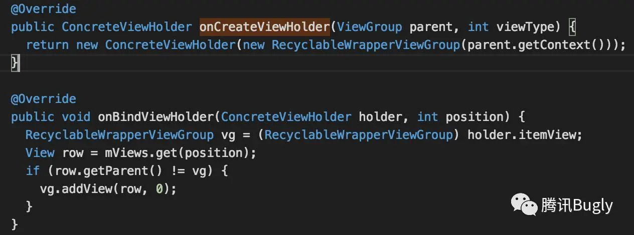 就是它确实引入了一个原生的 RecycleView 来去做布局,那么再深入来看一下,Android在 Native代码中是怎么来做的,我们我们重点看 onCreateViewHolder 和 onBindViewHolder 的实现
