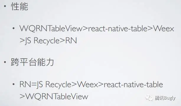 从性能上来看,因为从顺序上来说,我觉得我们客户端实现的那个相对来说比较好一点,因为它用的这个相对来说,从内存上面来说,占用比这个上面更少一些,但是这个也要看需求。weex 本身会比 RN 以及用JS端的实现更好。