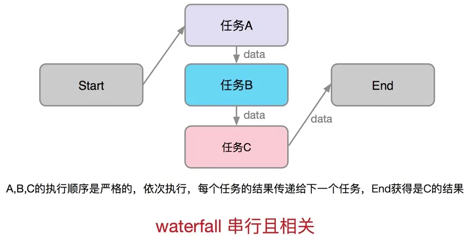 waterfall瀑布式的任务,会按次序一个个执行,但是数据的流向并不是终点的callback,而是传递给下一个,所以更像是流水线作业,把数据的锅抛来抛去。