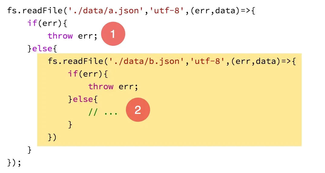 如果使用传统的回调方式,在异步任务数量增加时,便无法控制,下图展示了仅仅二层的异步回调:
