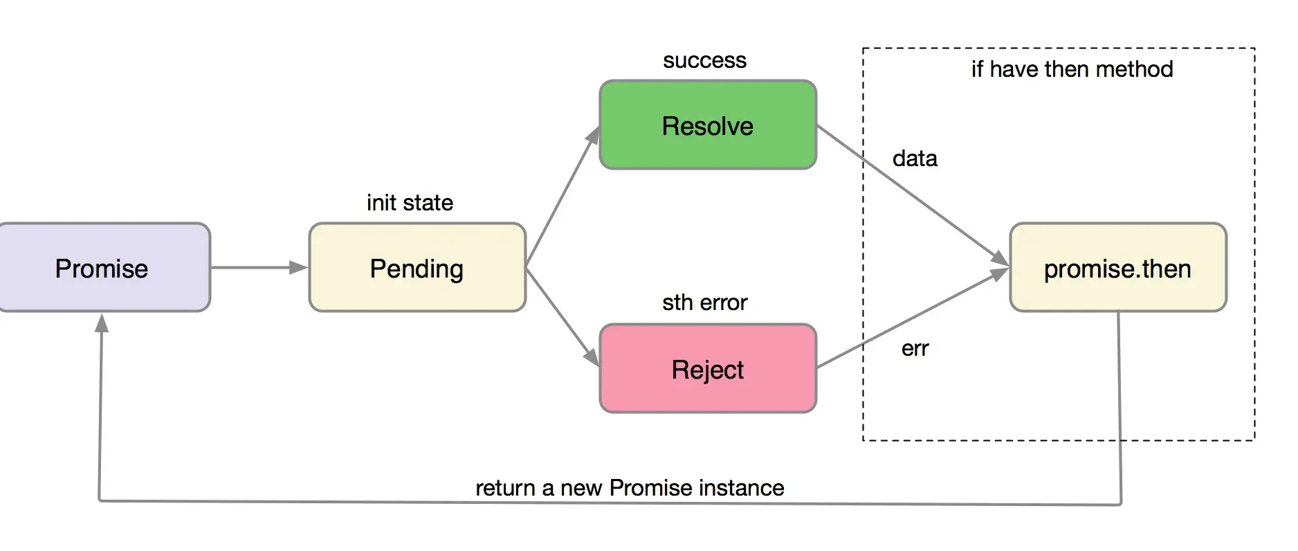 Promise采用的是你先去执行,随后通知我,我来处理怎么做的形式,可以通过then方法串起来,then方法依然返回的是一个新的Promise实例,它的状态取决于then方法体内的返回值,如果是一般类型,则直接转到resolve状态,如果是Promise对象,那么会转入对这个新的Promise的处理中来。