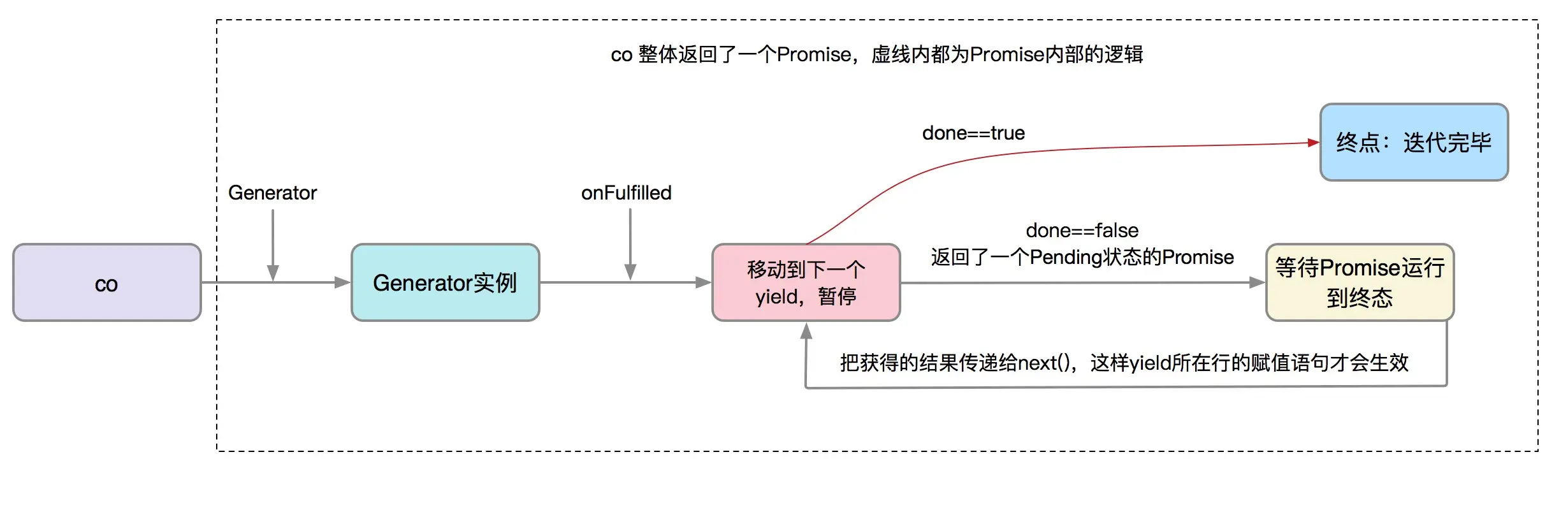 - 接下来为ES6规范里的Genetator,它提供了一个可以暂停与恢复的内部迭代器,本身并不具有改进异步的特点,但是可以使用co库结合Promise实现优雅的异步写法。