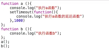 以上代码会先执行函数a,而且不会等到a中的延迟函数执行完才执行函数b, 在延迟函数被触发的过程中就执行了函数b,当js引擎的event 队列空闲时才会去执行队列里等待的setTimeout的回调函数,这就是一个异步的例子