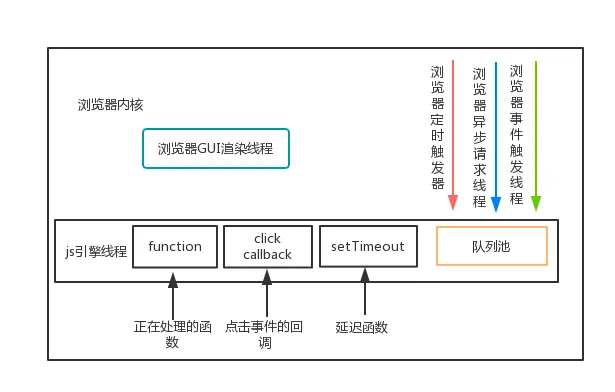 看到此图你是不是会豁然开朗许多,因为浏览器是一个多线程的执行环境,在浏览器的内核中分配了多个线程,最主要的线程之一即是js引擎的线程,同时js事件队列中的异步请求,交互事件触发,定时器等事件都是由浏览器的事件触发线程进行监听的,浏览器的事件触发线程被触发后会把任务加入到js 引擎的任务队列中,当js 引擎空闲时候就会开始执行该任务
