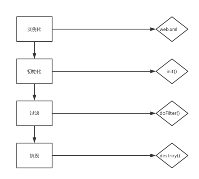 在web.xml中配置filter,当启动服务器时会实例化,并且会初始化,当有网络请求时会进行过滤操作,当 服务器关闭时,会进行销毁,全过程如下图所示: