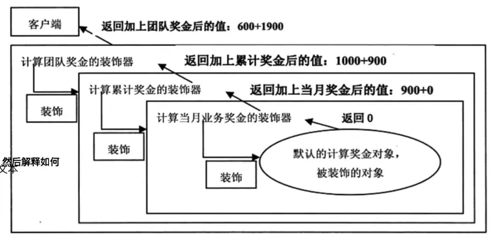 从上面的测试可以看出,不管是使用何种奖金组合方式,只需要调用对应的装饰器即可,非常灵活。通过上面的代码我们看到,装饰器是一层层包裹的,基本工资被月工资装饰器包裹,月工资装饰器被累积奖金装饰器包裹,累积装饰器被团队奖金装饰器包裹,当调用计算奖金的公式的时候,就会按照顺序层层递归调用每个装饰器的功能,到最后算出总工资,我们来用示意图看看调用过程。