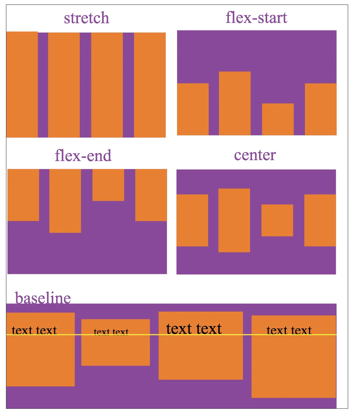 align-tiems设置的对齐方式,和侧轴的方向有关,下图以flex-direction为row,侧轴方向是从上到下,描述align-items的5个值显示效果: