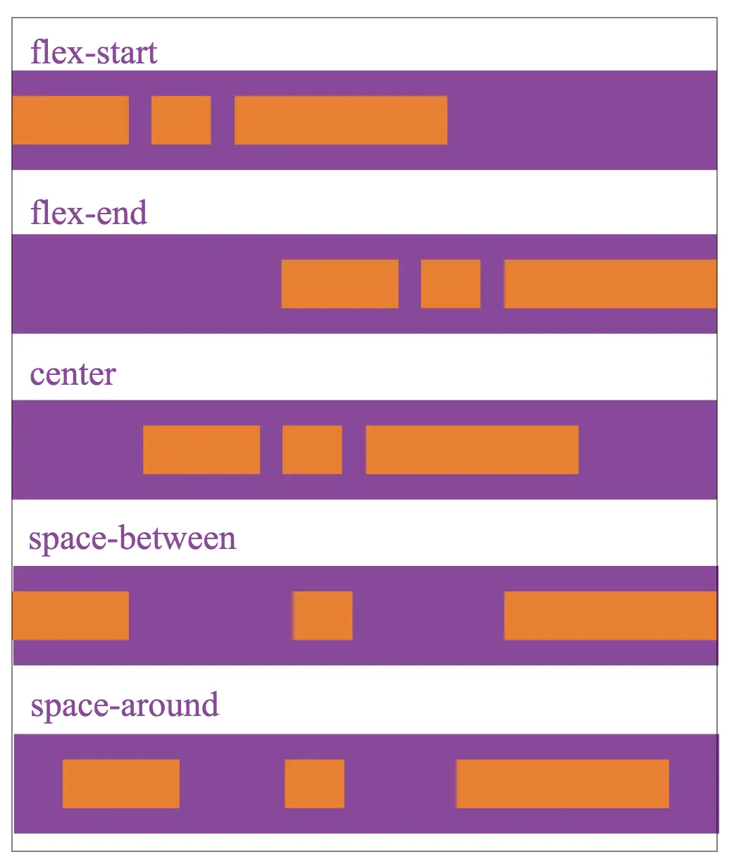space-around每个子元素之间的距离相等,两端的子元素距离容器的距离也和其它子元素之间的距离相同。justify-content的对齐方式和主轴的方向有关,下图以flex-direction为row,主轴方式是从左到右,描述jstify-content5个值的显示效果:justify-content