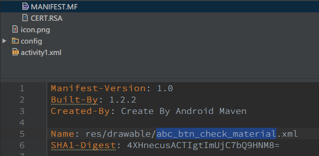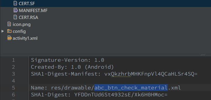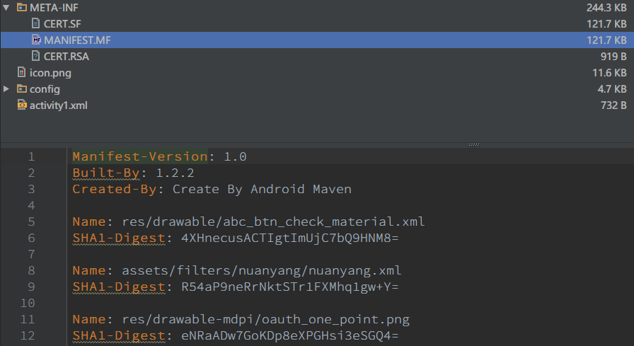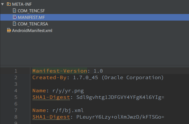 META-INF目录下存放的是签名信息,用来保证apk包的完整性和系统的安全性,帮助用户避免安装来历不明的盗版apk。