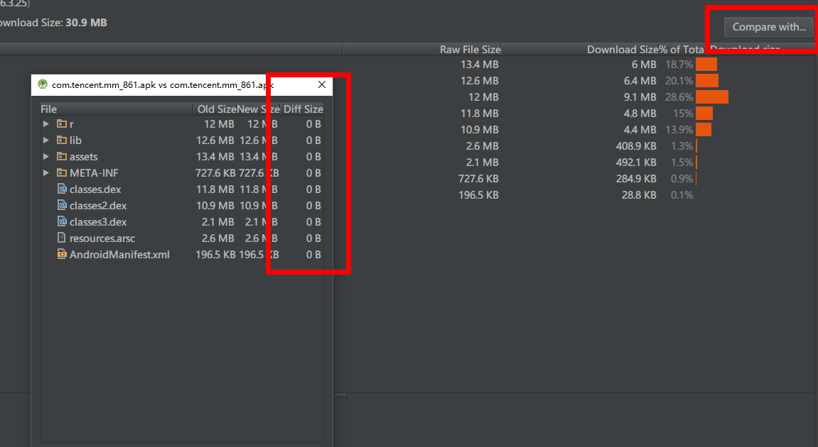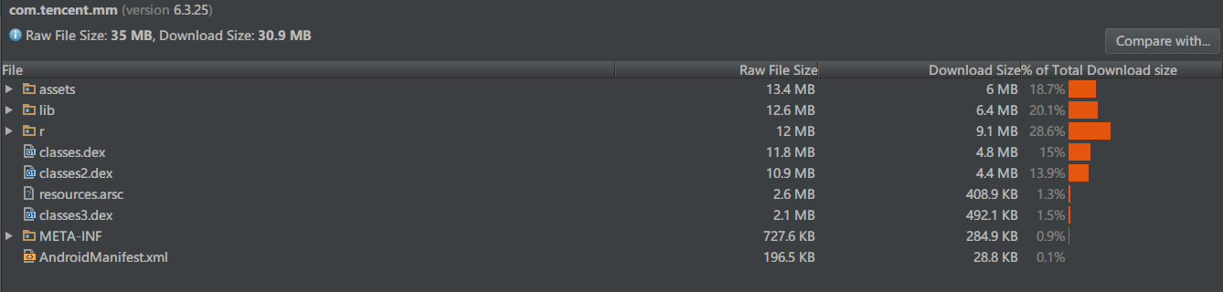 分析完成后你还可以看到具体类目占的百分比,清晰明了。旁边的“对比”按钮提供了diff的功能,让你可以方便的进行apk优化前后的对比,简直利器。