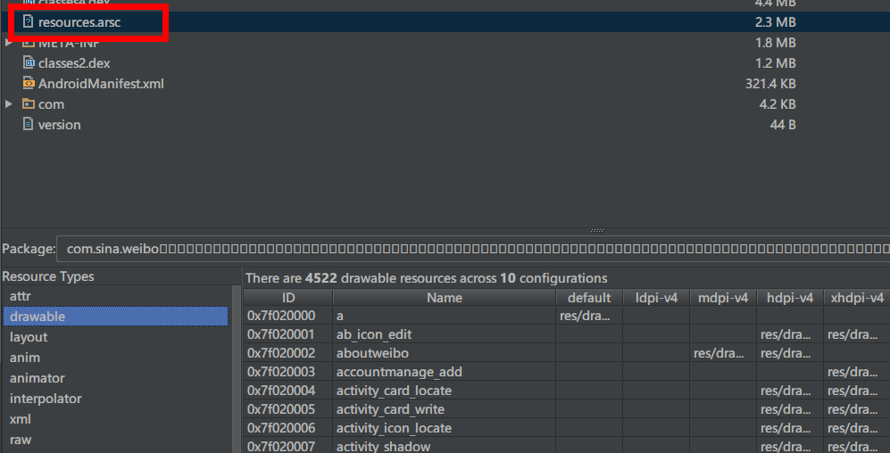 这个文件是编译后的二进制资源文件,里面是id-name-value的一个map。因为微信做了资源的混淆,所以这里可以看到资源名称都是不可读的。