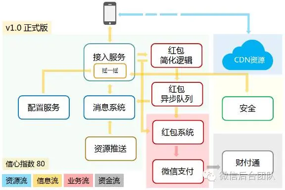 我们在用户操作和红包处理逻辑之间加入了一个中间层。这个中间层包括红包简化逻辑和红包异步队列,实现了信息流和业务流的异步化和解耦。