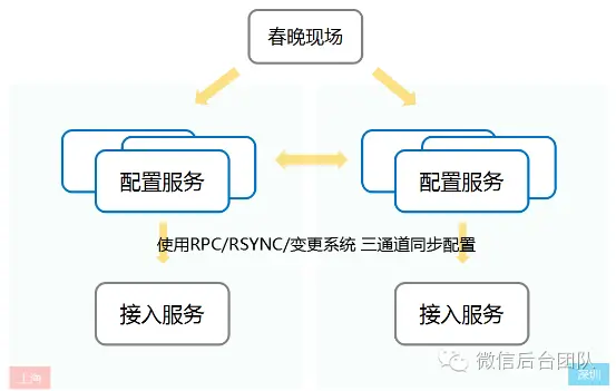 春晚现场有一个配置前台,现场人员可以通过这个配置前台发送变更指令到后台。后台有上海和深圳两个接收点,每个接收点由处于不同园区的3组冗余的配置服务构成。配置服务接收到配置后会同步到另一接收点,同时以文件形式下发到所有接入服务。为确保同步成功,使用了RPC/RSYNC/变更系统三个冗余变更通道来同时变更配置。从配置前台发起变更,到接入服务加载配置,全程可以在10秒内完成。
