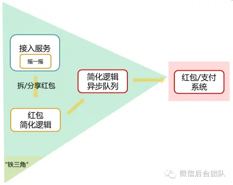 接入服务、红包简化逻辑服务、红包异步队列构成了所谓的“铁三角”,可以在红包系统出现严重问题时,保护用户体验在较长时间内基本不受损,争取到修复故障的宝贵时间。