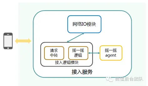 用户摇动手机后,客户端产生摇一摇请求,请求发到接入服务后,会被转发到摇一摇服务;