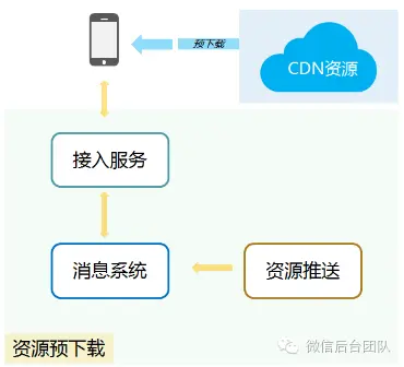 资源推送模块负责将资源上传到CDN,同时推送资源列表给客户端。推送过程基于微信消息系统实现,可以在极短时间内把资源列表推送给几亿的用户。