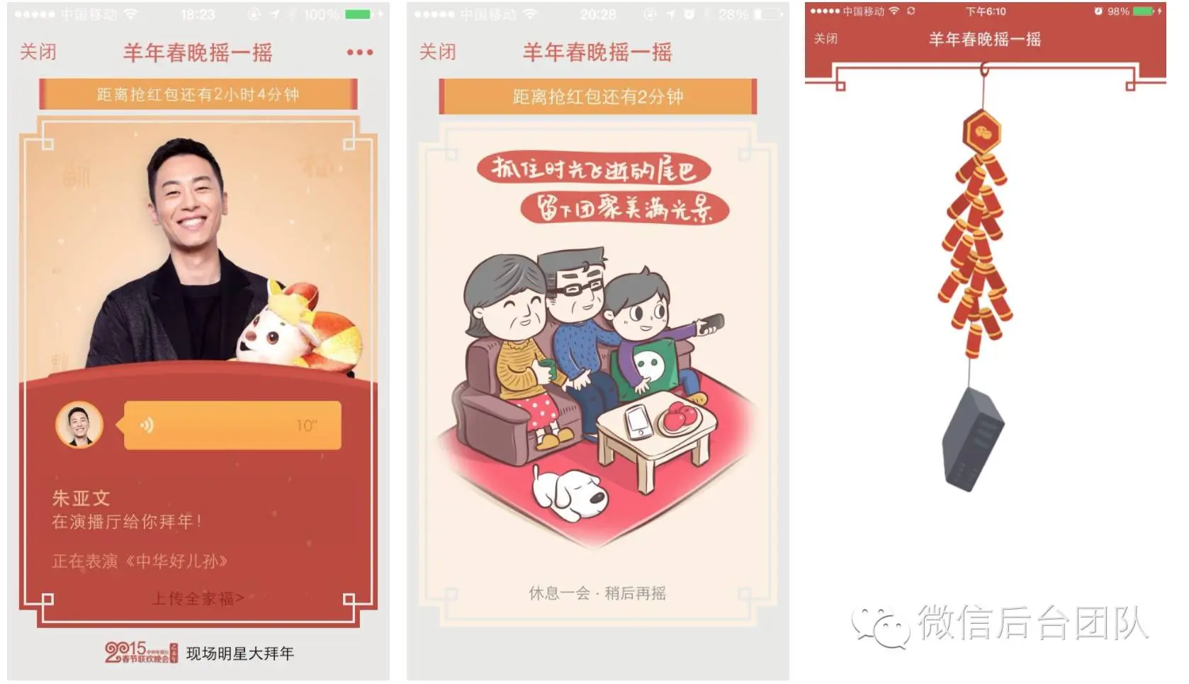 在羊年春晚摇一摇界面里,用户摇动手机后,可以看到明星拜年、全家福、好友贺卡等精彩纷呈的活动页;也会有温馨的“休息一下”,或让很多误以为中奖的“挂服务器”等特殊用途的页面。