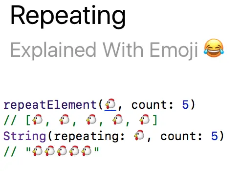 理想情况下,这些示例应当都可以在 Swift Playground 当中编译运行,我同样赞同使用其他 Emoji 来阐述这些功能,即使实现起来相当棘手。