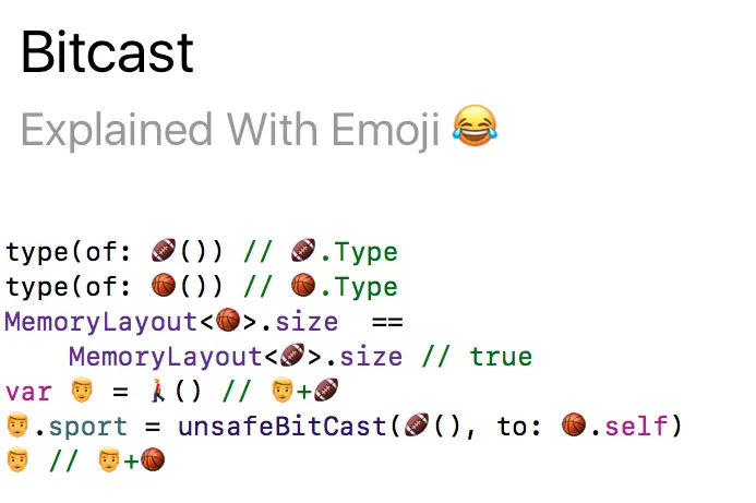 很遗憾的是,足球并不是一个合法的字符标识符,所以我无法在足球和橄榄球之间执行 bitcast 操作。这种不一致的 Emoji 字符集让我很不开心。Swift 需要对操作符和标识符进行基于标准的改造。