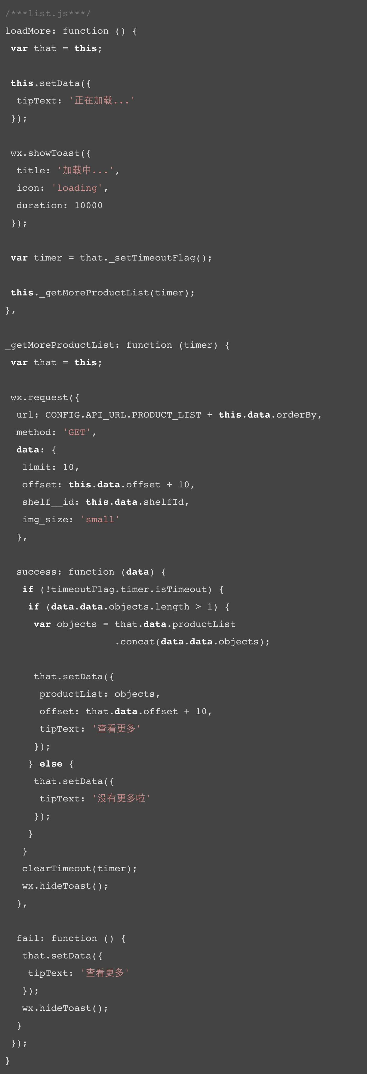 loading 设置 10000 毫秒延迟时间,超过 10000 毫秒后,即使请求成功,也不保存任何数据。同时,将按钮文字改回「查看更多」即可。我们初始化一个 timeoutFlag 的对象,使用 timer = setTimeout() 设置 9800 毫秒延时。9800 毫秒后,以 timer 为 key 设置一个对象 { isTimeout: true },每次发起请求时都会有一个 timer 作为标识。若请求成功时 timeoutFlag.timer 的值为 { isTimeout: true },则不处理请求成功后的数据。为什么要设置 9800 毫秒而不是 10000 毫秒呢?那是因为 setTimeout 的计时并不准确,我们给出 200 毫秒的提前量,以防止代码出错。我们来封装一个 _setTimeoutFlag 方法: