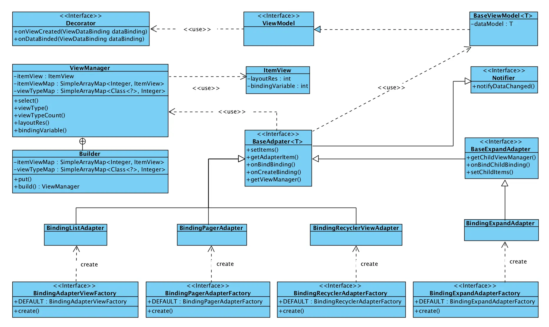 另外data binding在项目中只是负责了数据与视图绑定的操作,对于库当中其他的核心功能以及整个库的架构是没有强耦合的,因此我们完全可以通过开放数据绑定的逻辑接口方法,就能够实现一个不依赖data binding的adapter库。