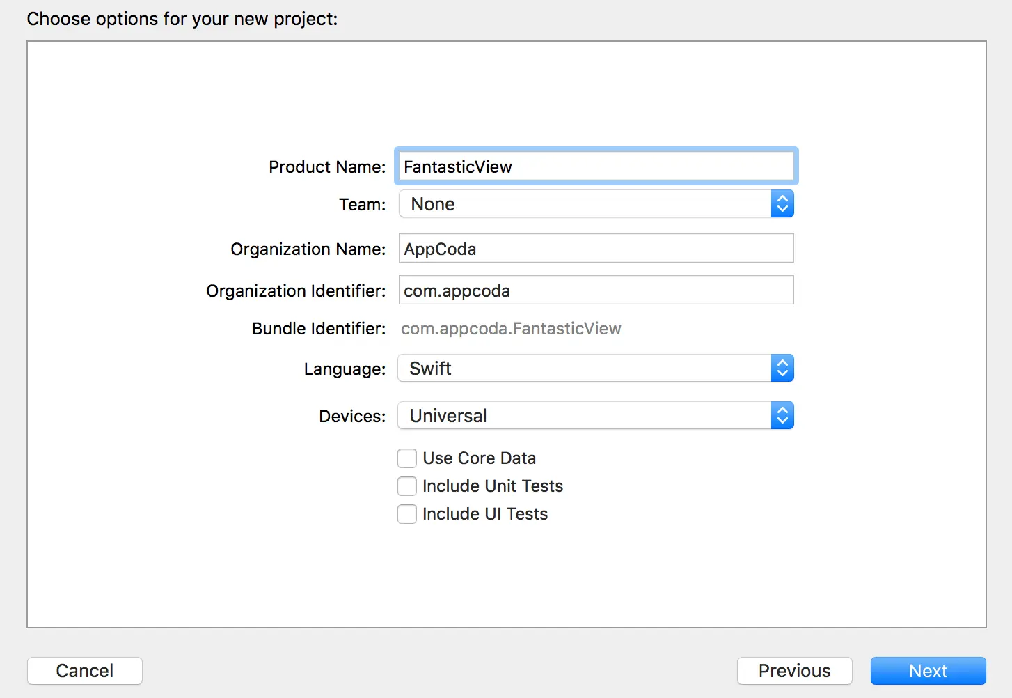 让我们先从最基础的地方开始。首先,在 Xcode 中创建一个新工程,选择使用 single view 模版。将工程命名为 FantasticView。项目创建之后,添加一个同名的 Swift 文件 FantasticView.swift。