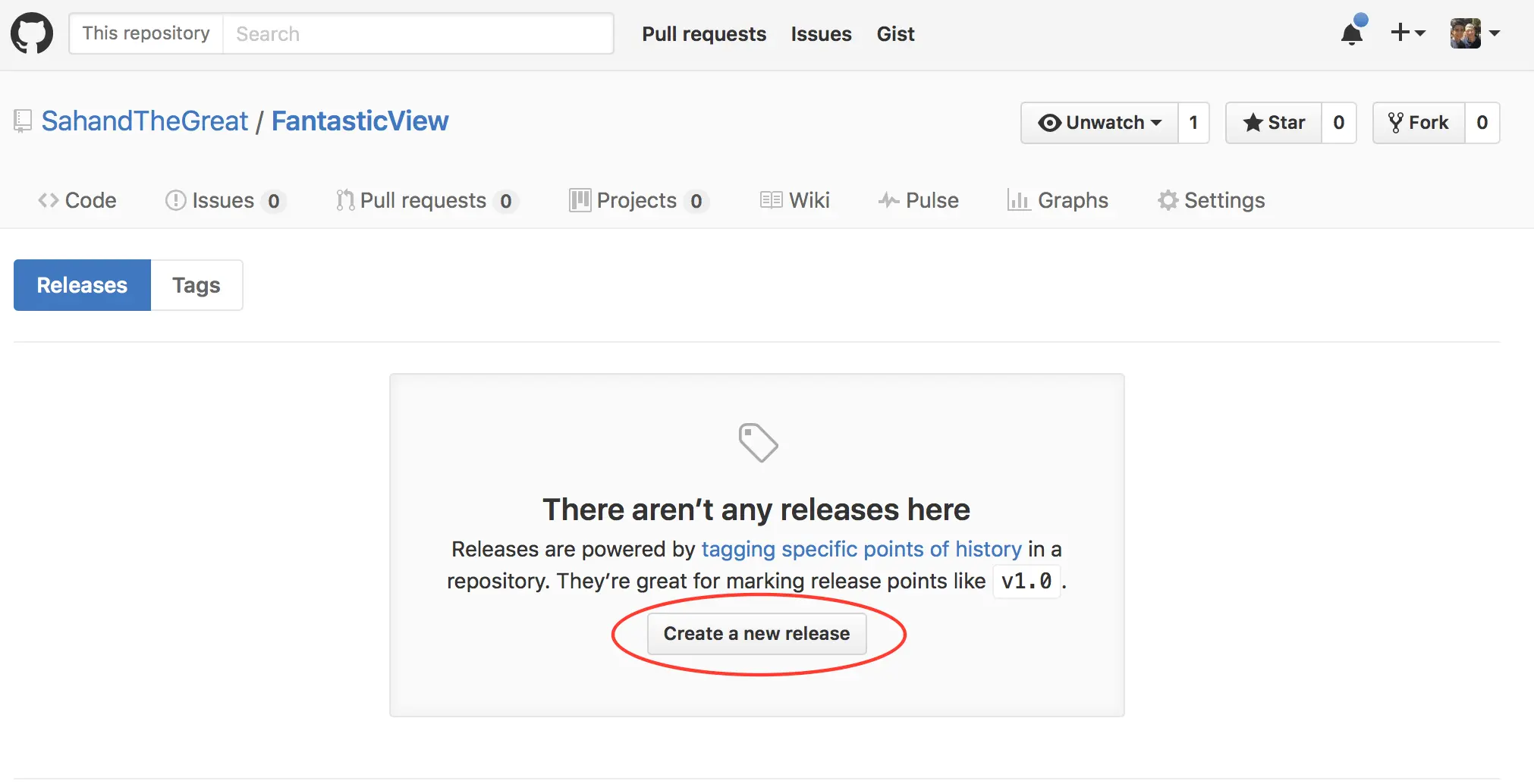 现在你必须为你的仓库创建一个 release。一个 release 对应产品的一个新版本。你可以在 Github 的操作面板上尝试创建。首先进入你的仓库。