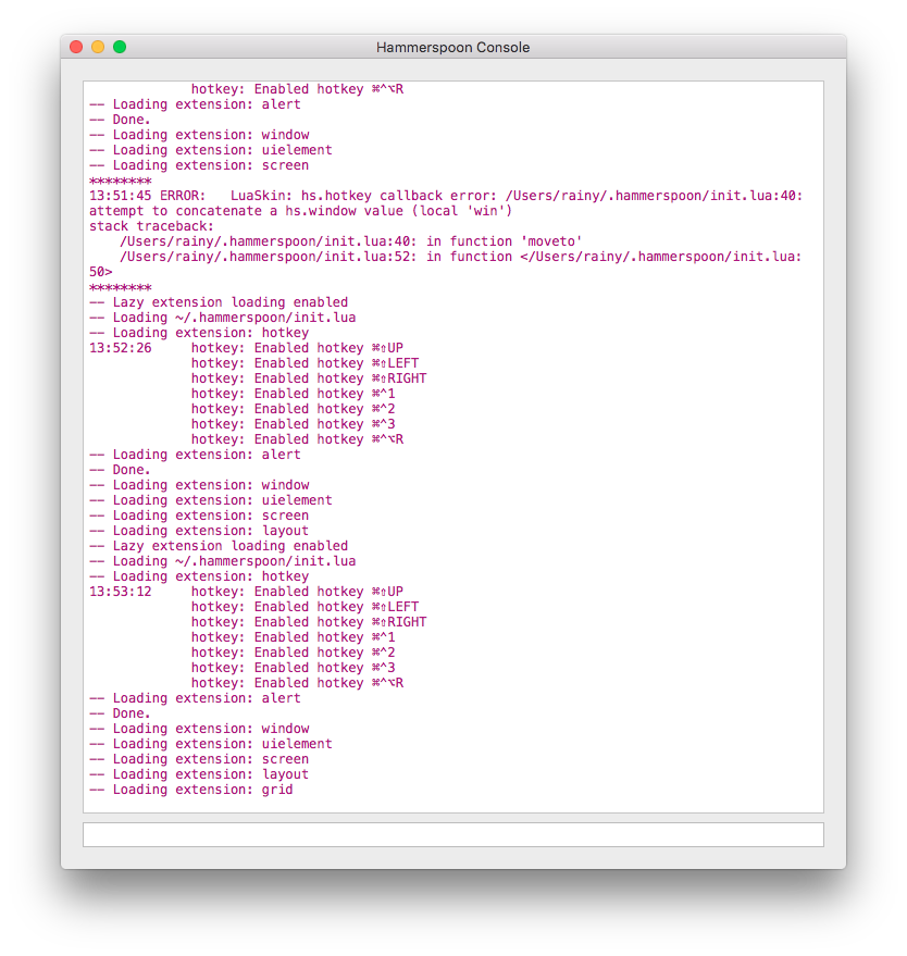 我的配置文件在 这里 Gist-hammerspoon.init.lua,保存到本地~/.hammerspoon/init.lua,然后 Reload Config 即可。Hammerspoon 还提供一个 Console 界面,可以方便调试: