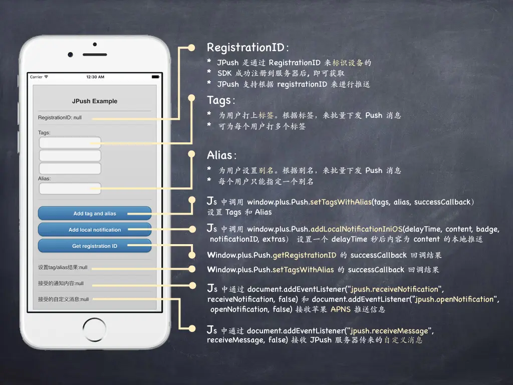 通过以上配置,就可以在 JavaScript 中通过 Push --> JPushPlugin 的对应关系,调用 native 代码了。
