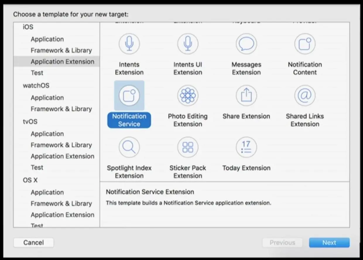 然后会自动创建一个 UNNotificationServiceExtension 的子类 NotificationService,通过完善这个子类,来实现你的需求。