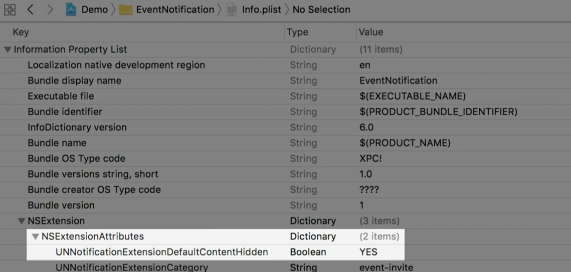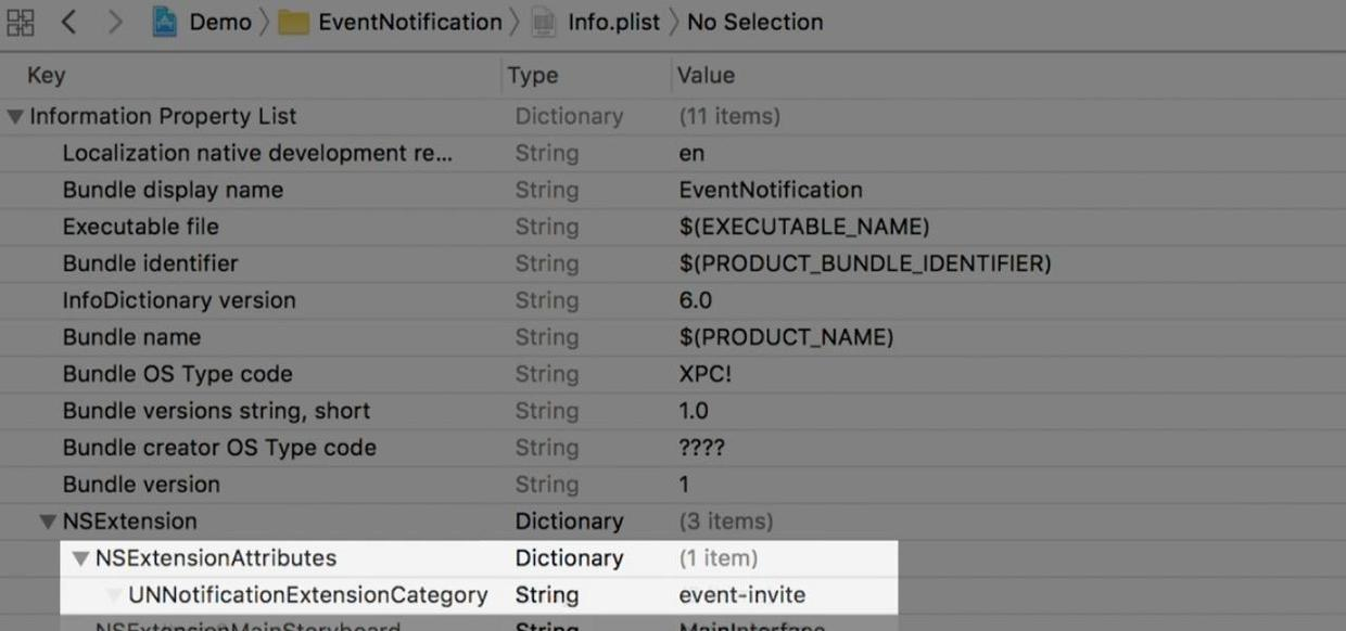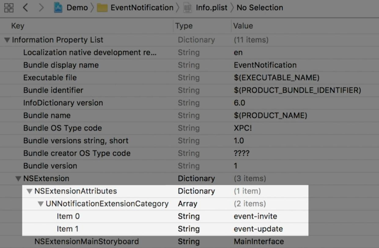 高亮部分字段的值,需要跟 Notification Actions 的 category id 值一样,这样收到推送时,就会同时触发 Notification content + Notification actions。同时这里也可以添加多个值,用于收到不同的推送,展示类似的 UI。
