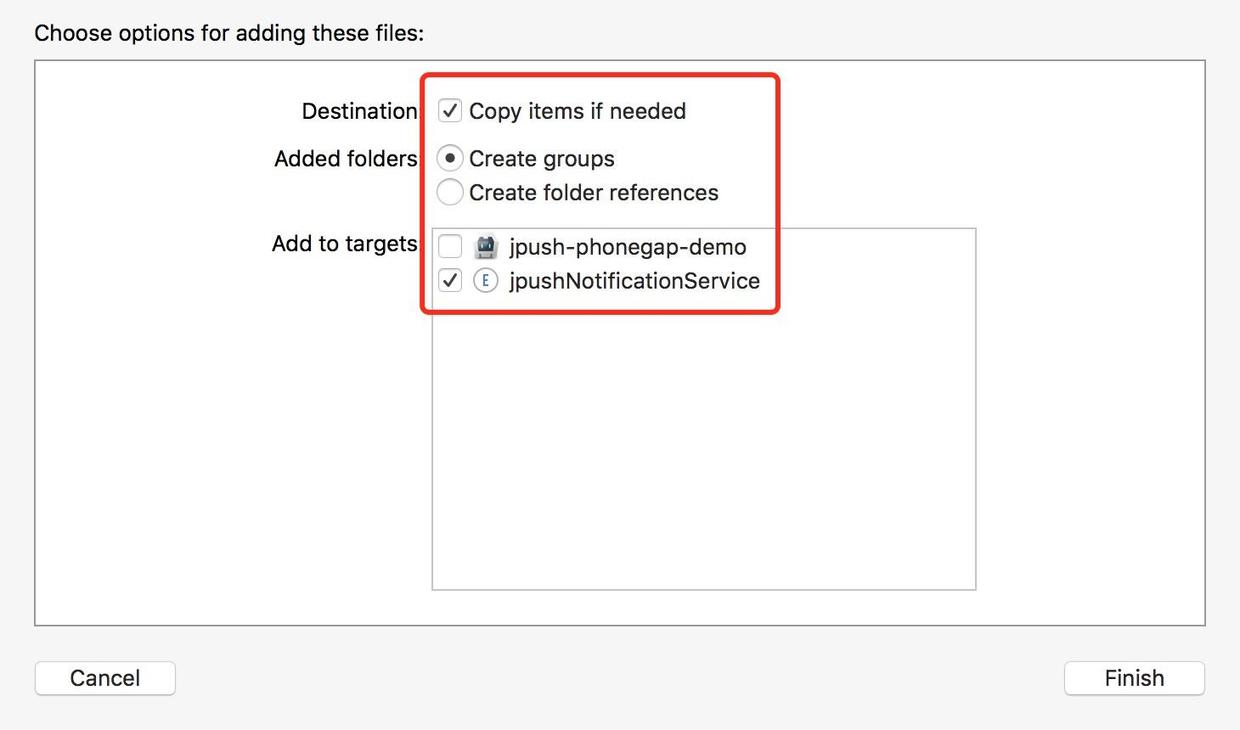 yourPushNotificationService文件夹下,勾上 copy to items,add to targets 一定要选择这个 Notification Service 作为 target,如下所示。