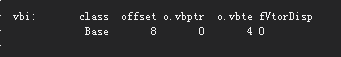 下面列出了两张虚表,第一张表是vbptr指向的表,8表示{vbptr}与{vfptr}的偏移;第二张表是vfptr指向的表,-8指明了这张表所对应的虚指针位于内存的偏移量。